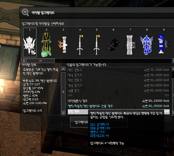 아이데른식 개조는 언급할 가치조차 없고 켈틱 하울링 체인 블레이드 전용 개조는 맥뎀을 21 증가시켜주지만, 장인 개조가 유동옵(0~25)이긴 하나 맥뎀이 25까지 뜨고 행운도 유동(0~30)으로 30까지(행운 4당 체인맥 1) 뜨므로 데미지 상승 기대치가 더 높습니다.