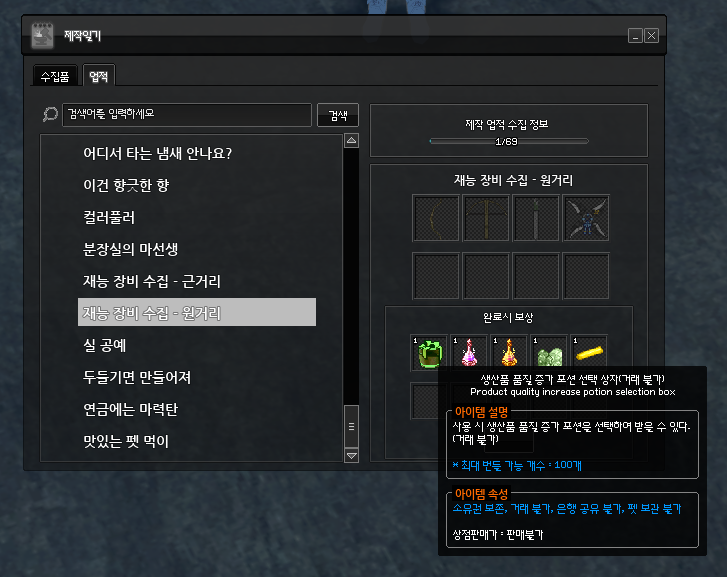 수집 일기 보상으로 얻을 수 있는 *생산품 품질 증가 포션 정도가 추가로 챙길 수 있는 부분이겠네요. 얻기 조금 까다로운 편이라 저는 보통 스킵하지만 고가의 아이템을 제작할 때는 챙길 수 있으면 금상첨화겠죠?