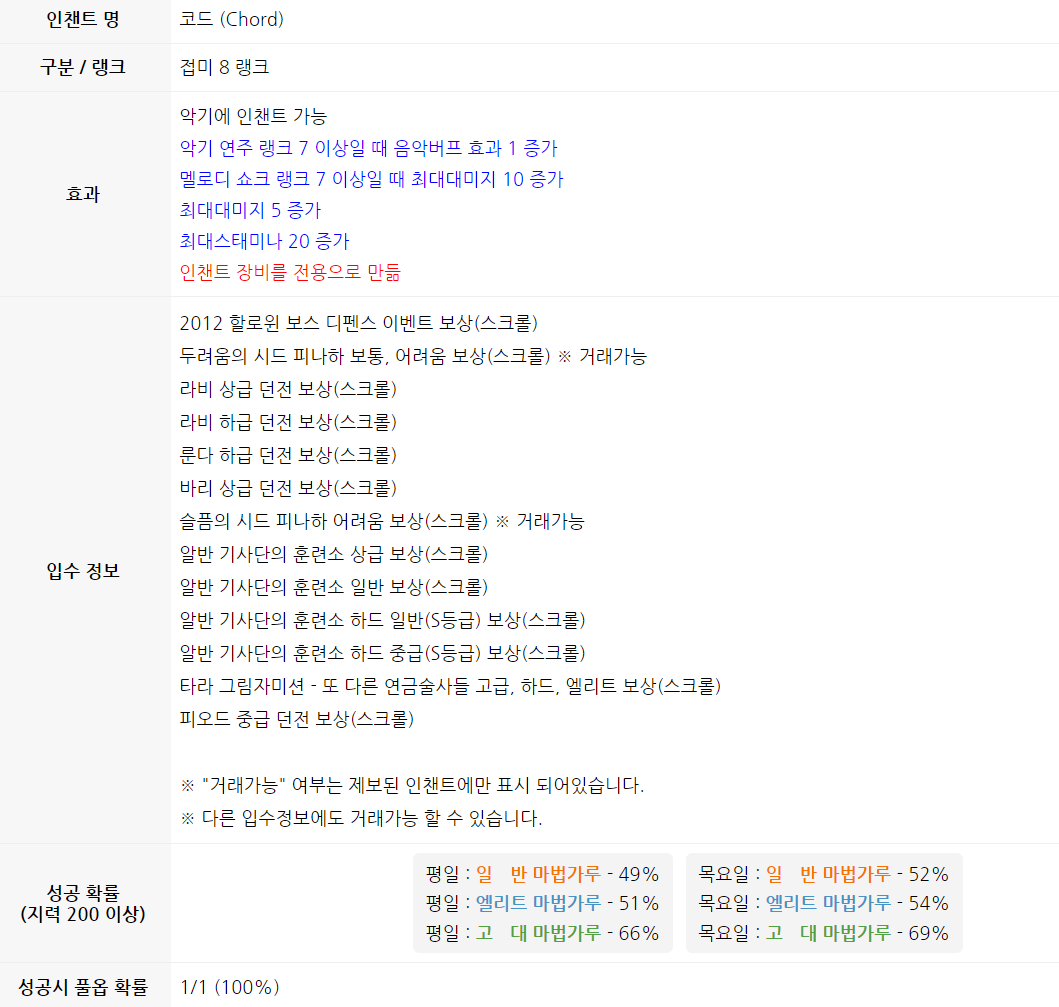 인챈트는 조화, 코드를 사용합니다. 조화 인챈트가 예전에 비해 많이 저렴해져서 아래 단계인 알레그로를 쓸 필요가 옅어졌으며, 코드 인챈트의 밑작은 9랭 감미로운 또는 4랭 리듬 인챈트로 작업해주신 후에 코드를 발라주시면 됩니다.