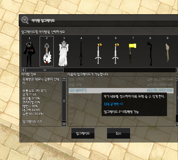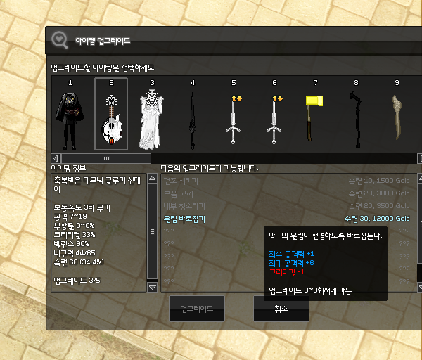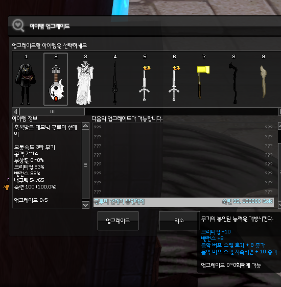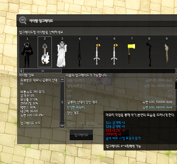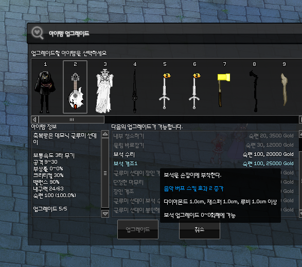 마지막 개조는 음악 버프 스킬 효과를 2 올려주는 *보석 개조1 입니다. 보석 수리 클릭 실수 주의하세요!