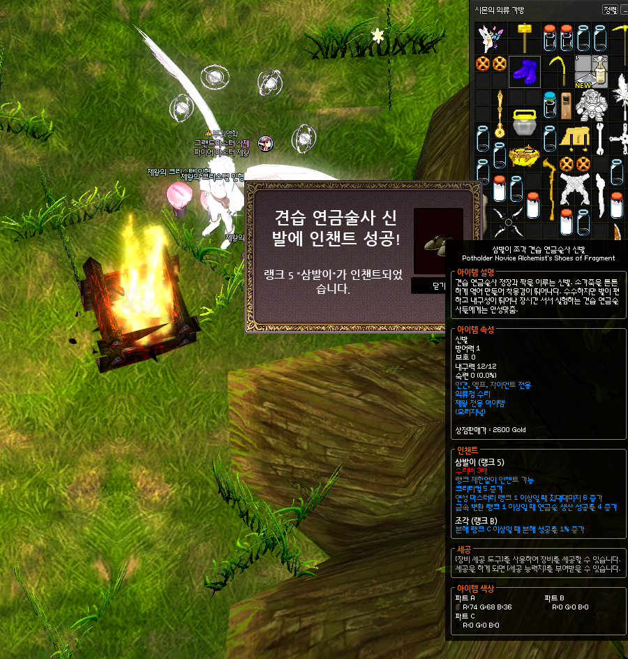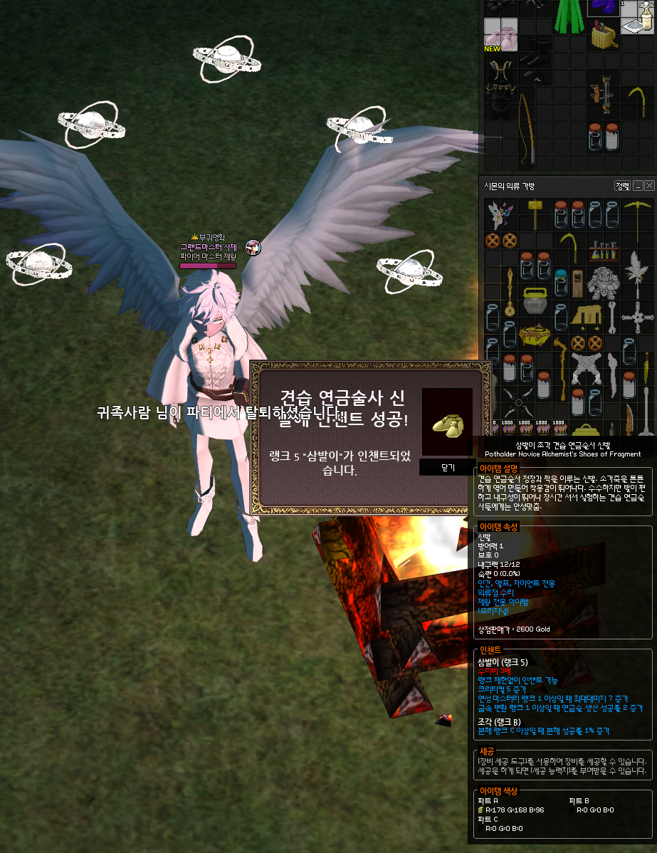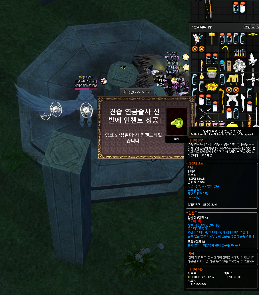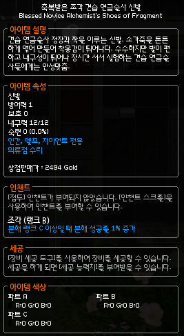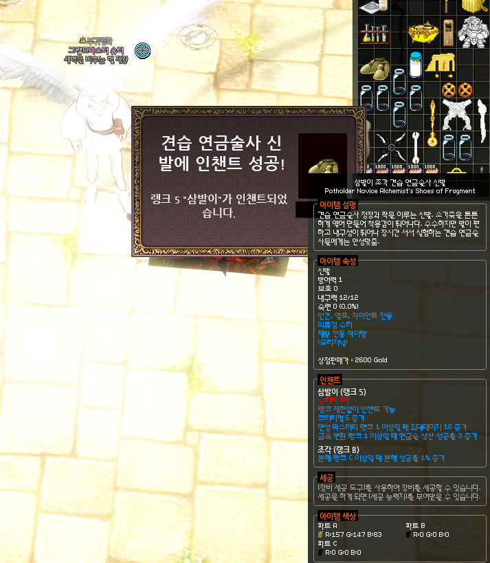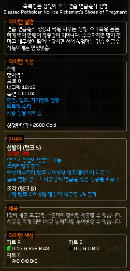 마지막인 신발에서 가장 핵심은 꼭 *조각 인챈트가 붙은 견습 연금술사 신발에다가 인챈트를 발라줘야한다는 것입니다. 분해 성공률을 1% 올려주는 조각 인챈트는 장갑에만 바를 수 있는 인챈트로, 현재 신발에는 분해 관련 인챈트가 없기 때문에 조각이 발려서 드랍되는 견습 연금술사 신발이 유일하게 1%를 더 챙길 수 있는 방법입니다.