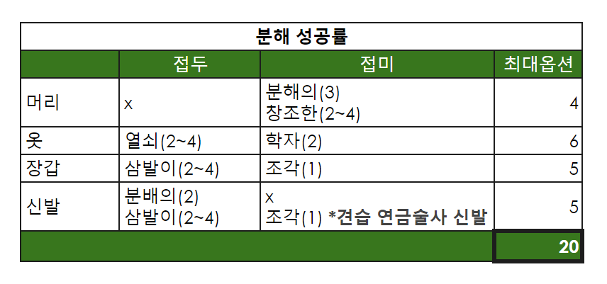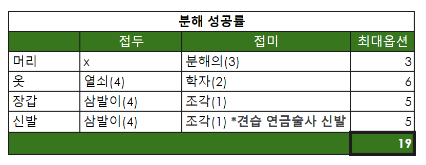 위 테이블에서 확인할 수 있듯이, 분해셋은 분해 성공률을 최대 20%까지 올려주는데요.
