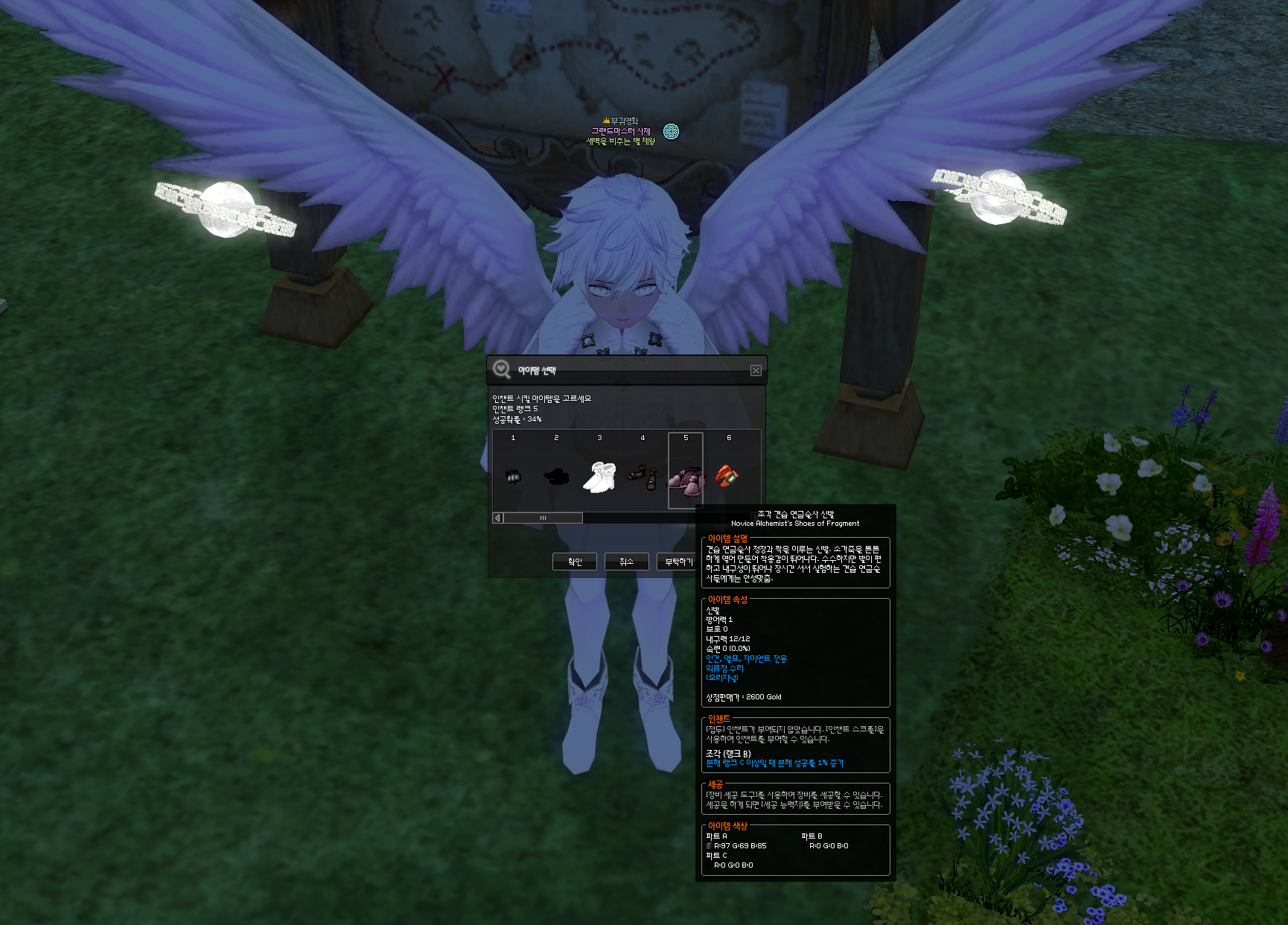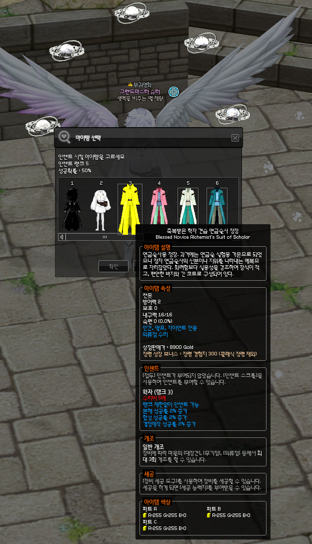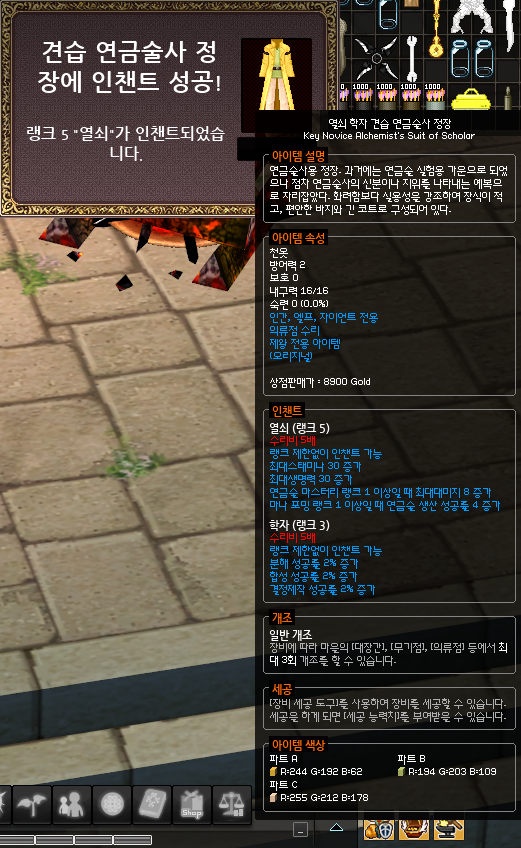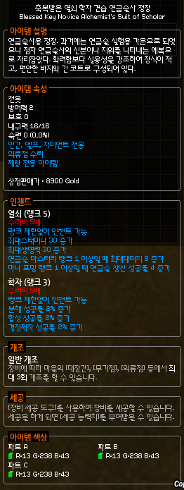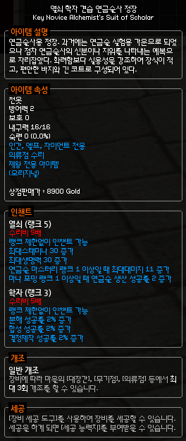 경매장에서 학자(스칼라) 인챈트가 붙은 견습 연금술사 정장을 구입해줍니다.