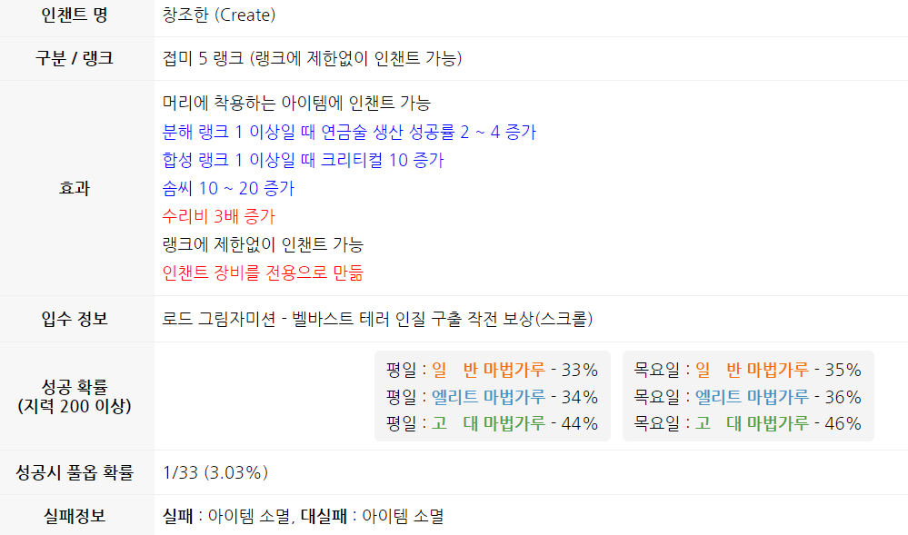또한 머리 접미 인챈트인 '창조한'은 3000~4000숲의 고가에 가격이 형성되어있고 매물도 흔치 않기 때문에 보다 가격이 저렴한 '분해의' 인챈트를 대신 사용하고 삼발이에서 풀옵을 띄우는 식으로 17% 이상을 맞춰서 사용합니다.