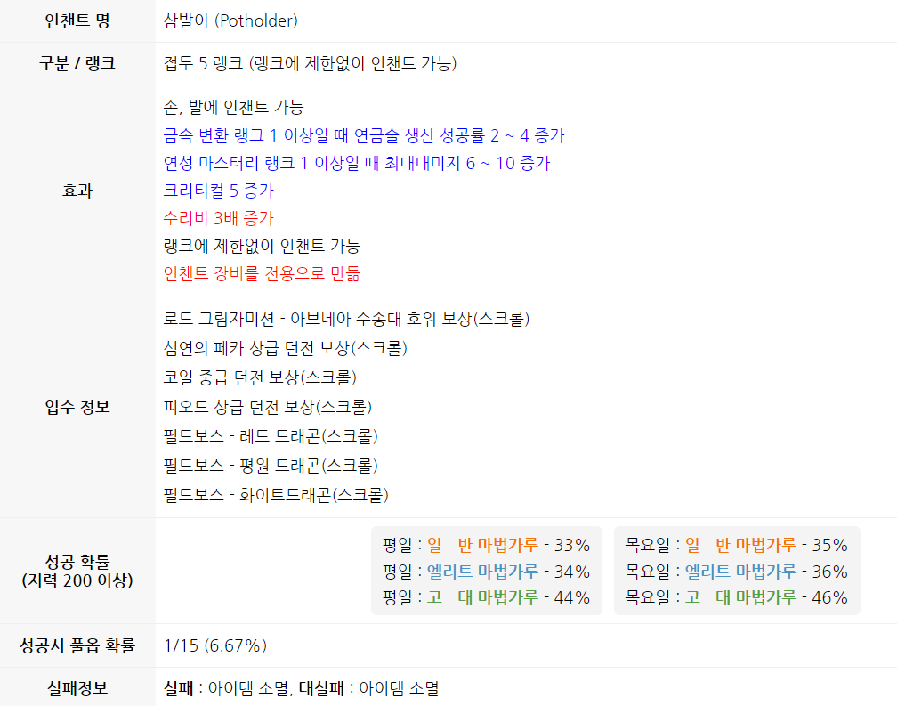 장갑이랑 신발에는 '삼발이' 인챈트가 핵심인데요. 전용 인챈트 스크롤이 최초 1회 거래 가능으로 변경되어 삼발이 인챈트가 예전에 비해 매우 구하기 쉬워졌습니다. 예전에는 '전용 해제 포션 갖고 오시면 무료로 드립니다' or '전해포 제공받고 50에 팝니다' 였기에 직접 구할게 아니라면 전해포 값이 부담되었지만 지금은 만돌린 서버 기준 경매장에서 50~100숲 사이면 값싸게 구입할 수 있습니다.