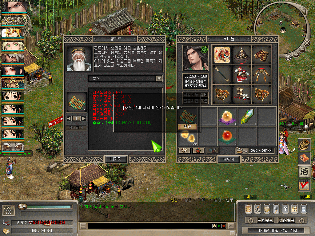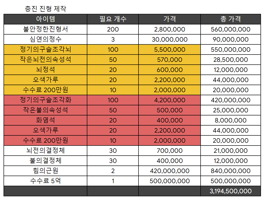 정기의구슬(雷)와 정기의구슬(火)를 각각 25개씩 만드는 비용과 불의정령석, 힘의근원 정도가 가장 많은 비용이 들어가는 핵심 재료라고 볼 수 있으며, '나는 쩐을 충전해서 일시불로 한번에 긁어버리겠다!' 하시면 위 개수대로 육의전에서 재료를 한꺼번에 구매하시면 되겠습니다. 80억 지전이 넘는 돈으로 억당 현금 3,000원으로 잡으면 24만원이라는 돈이 들어가네요 ㄷㄷ