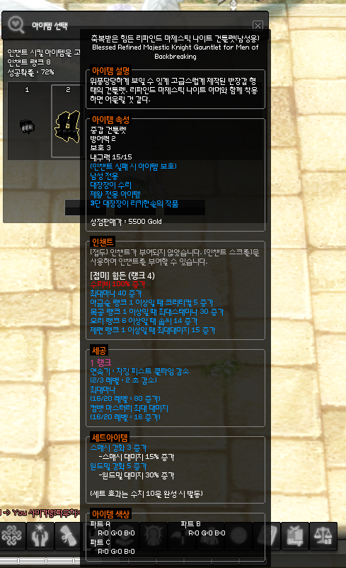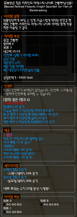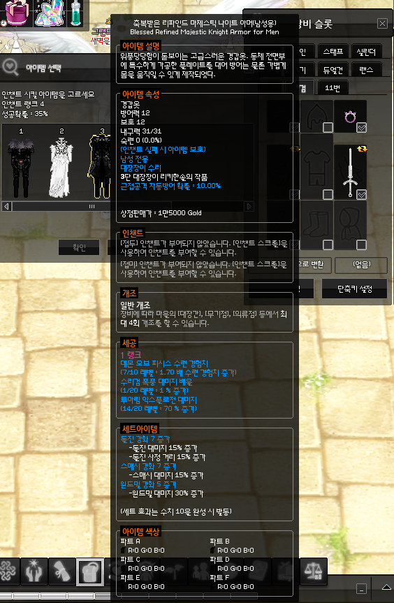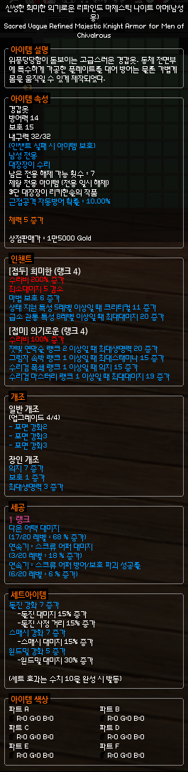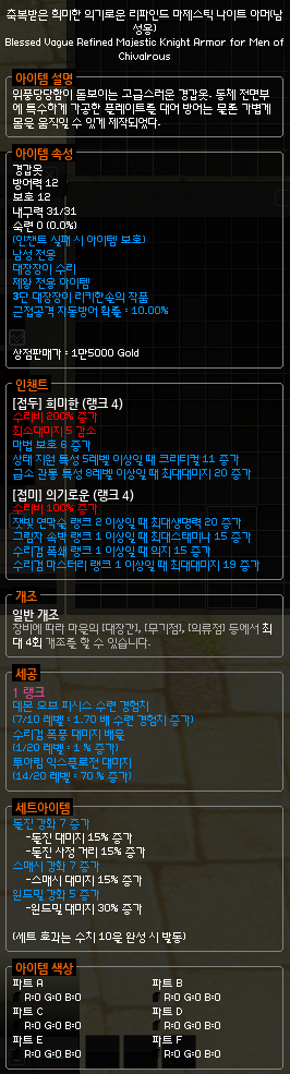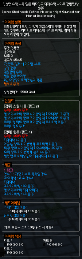 그래도 크롬바스를 돌다보니 스펙업의 필요성이 커져서 스매시 강화 효과가 있는 리파인드 마제스틱 나이트 세트를 맞추기로 했다. 무기로 디바인 블레이드를 사용하면 스매시 강화 효과가 발동되서 따로 맞출 필요가 없는데 켈로나쌍을 쓰고 있으니 따로 세트 효과를 챙겨줘야 한다.