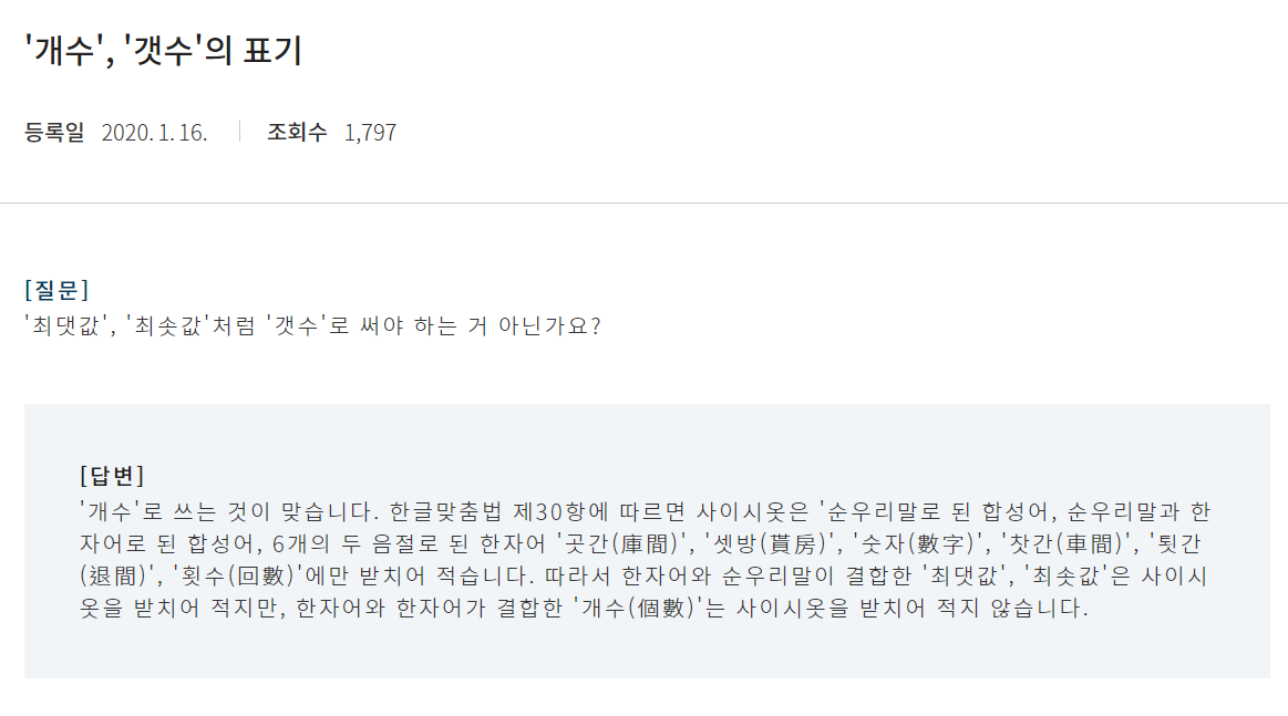 예외로 인정하는 여섯 낱말은 곳간(庫間), 셋방(貰房), 숫자(數字), 찻간(車間), 툇간(退間), 횟수(回數) 이렇게 한자어로만 이루어진 2음절의 낱말들 이라고 합니다. 맞아요 듣고 보니 이 단어들을 일상에서 정말 많이 써왔기 때문에 개수 vs 갯수가 더욱 헷갈렸던 것 같아요ㅠㅠ 숫자, 횟수 이런 것들은 정말 익숙한 데다가 전세방(傳貰房), 월세방(月貰房)은 사이시옷을 쓰면 안되는데 셋방은 또 예외로 쓸 수 있다고 하니 혼돈의 카오스..