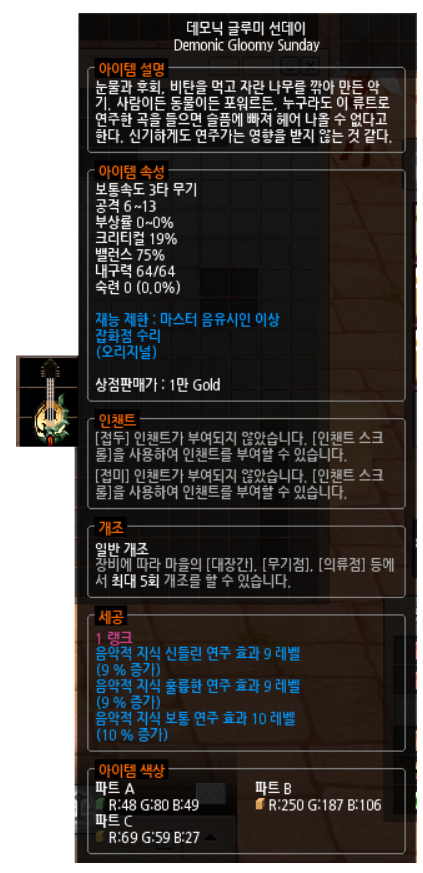 데모닉 글루미 선데이에 보통/훌륭한/신들린 연주 효과 세공을 10/10/10에 가깝게 띄우고 에코스톤으로 악효 20을 채우는게 악연 종결 세팅이라고 한다